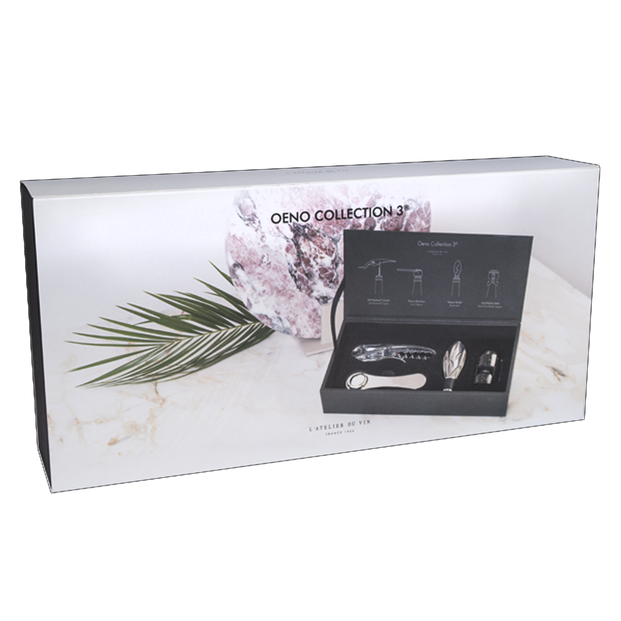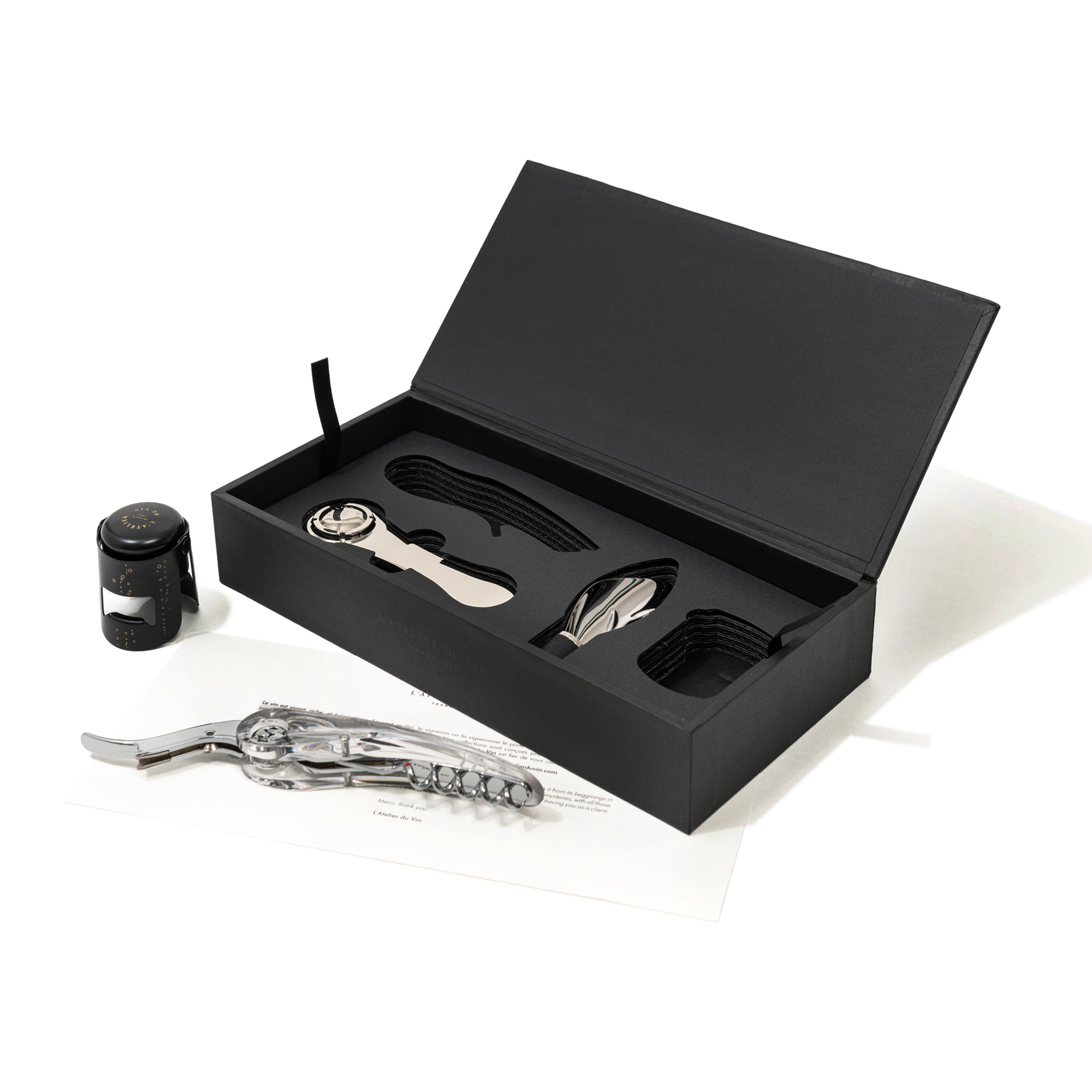 A minimal yet precious pocket-sized oenological toolbox, Oeno Collection 3 is designed for collectors and wine lovers alike. Encased in an elegant matte black wooden box, it holds four essential tools for a refined tasting experience.